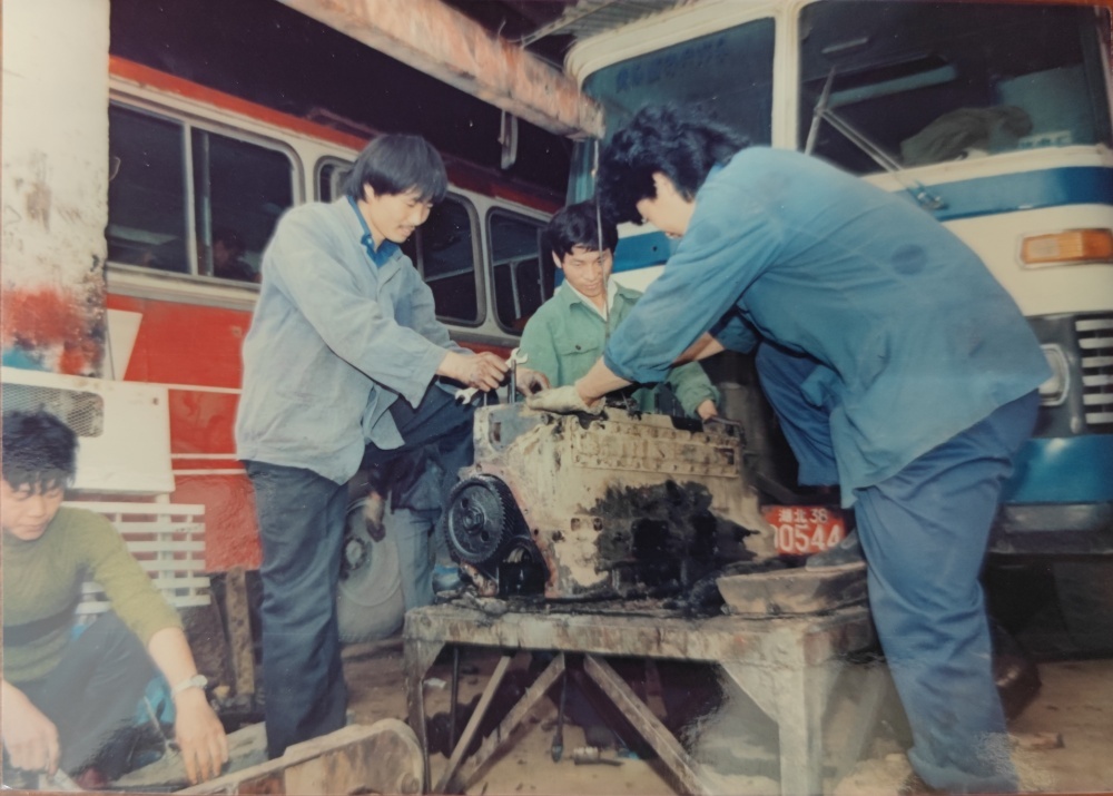 ▲80年代,車間修理工檢修模樣。3個(gè)機(jī)修工一同修理著車輛發(fā)動(dòng)機(jī),臉上沒(méi)有吃力感,更像是帶著興趣在專研。