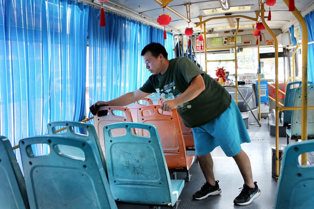 2020#車是揚子江早年出廠的一輛“老爺車”,今年即將達到報廢年限,但走進車廂內(nèi),地板明亮反光,車窗清晰透亮,窗簾座椅清爽整潔,更像是一輛嶄新的“空調(diào)車”,問起如何將車輛打掃得如此干凈,張峻峰講出了他的工作心得。