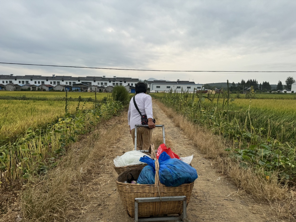 拖著滿籃蔬菜在晨光中前行,從田間到餐桌的旅程正在開啟。